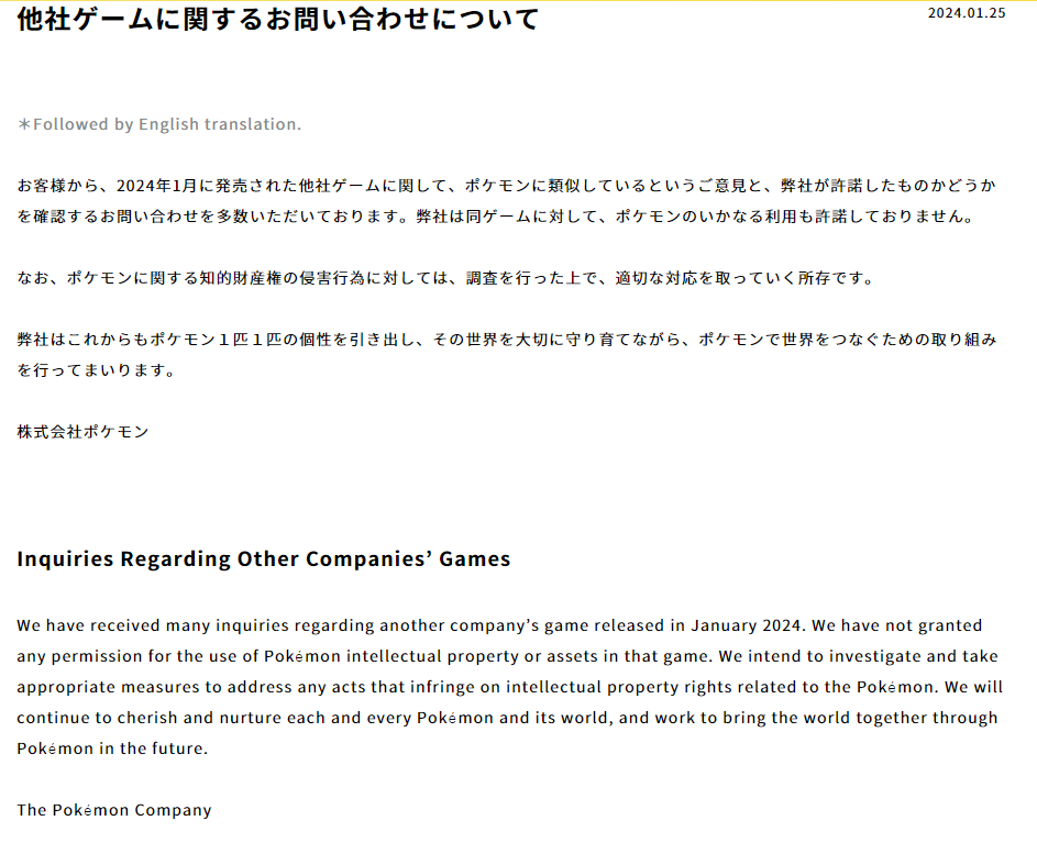 이에 2024년 1월 25일 포켓몬 컴퍼니는 공식 입장을 발표했습니다.