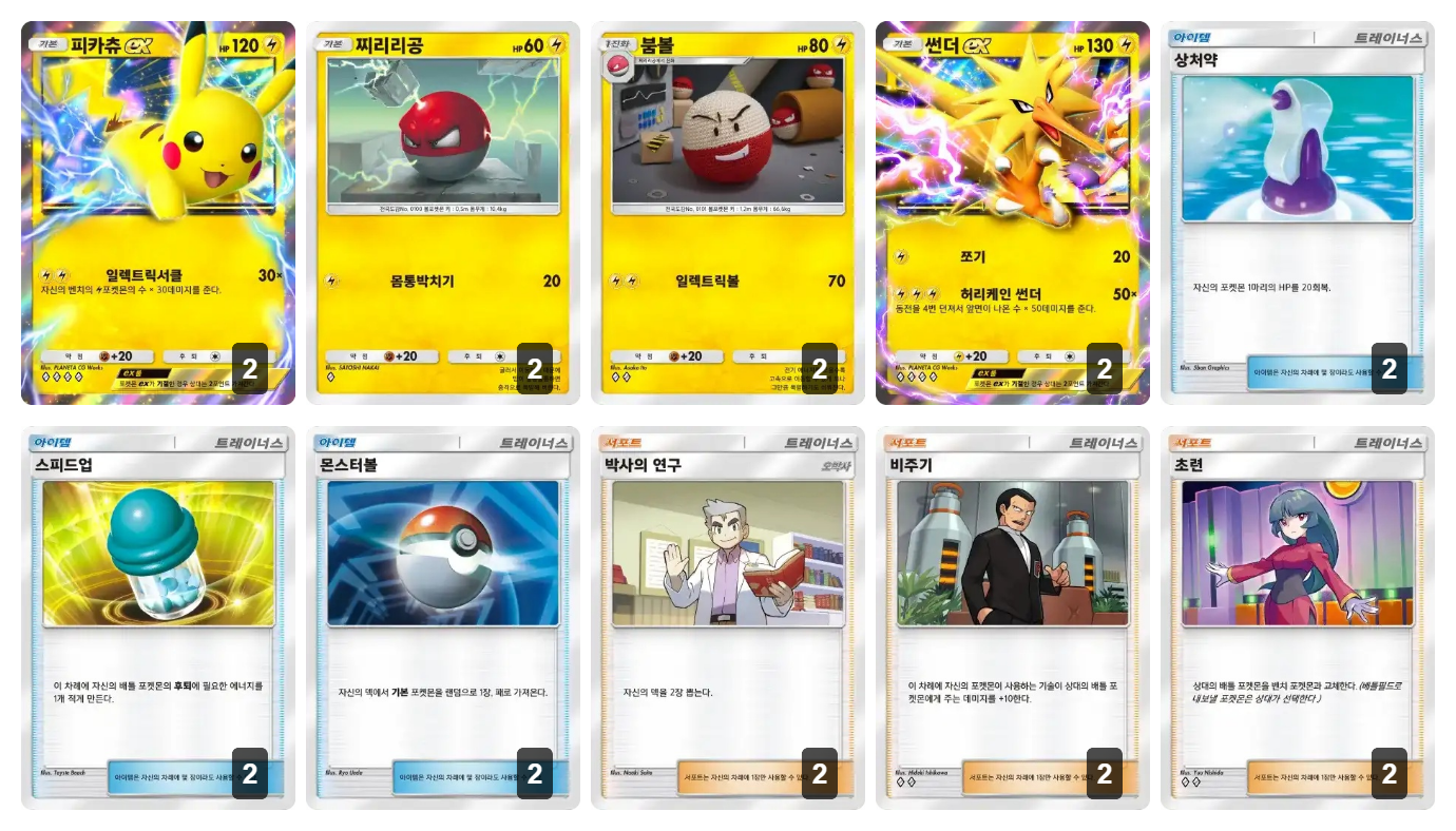 이외에도 피카츄덱은 전기타입이라면 여러 포켓몬을 채용해도 유연하게 덱빌딩을 할 수있습니다!