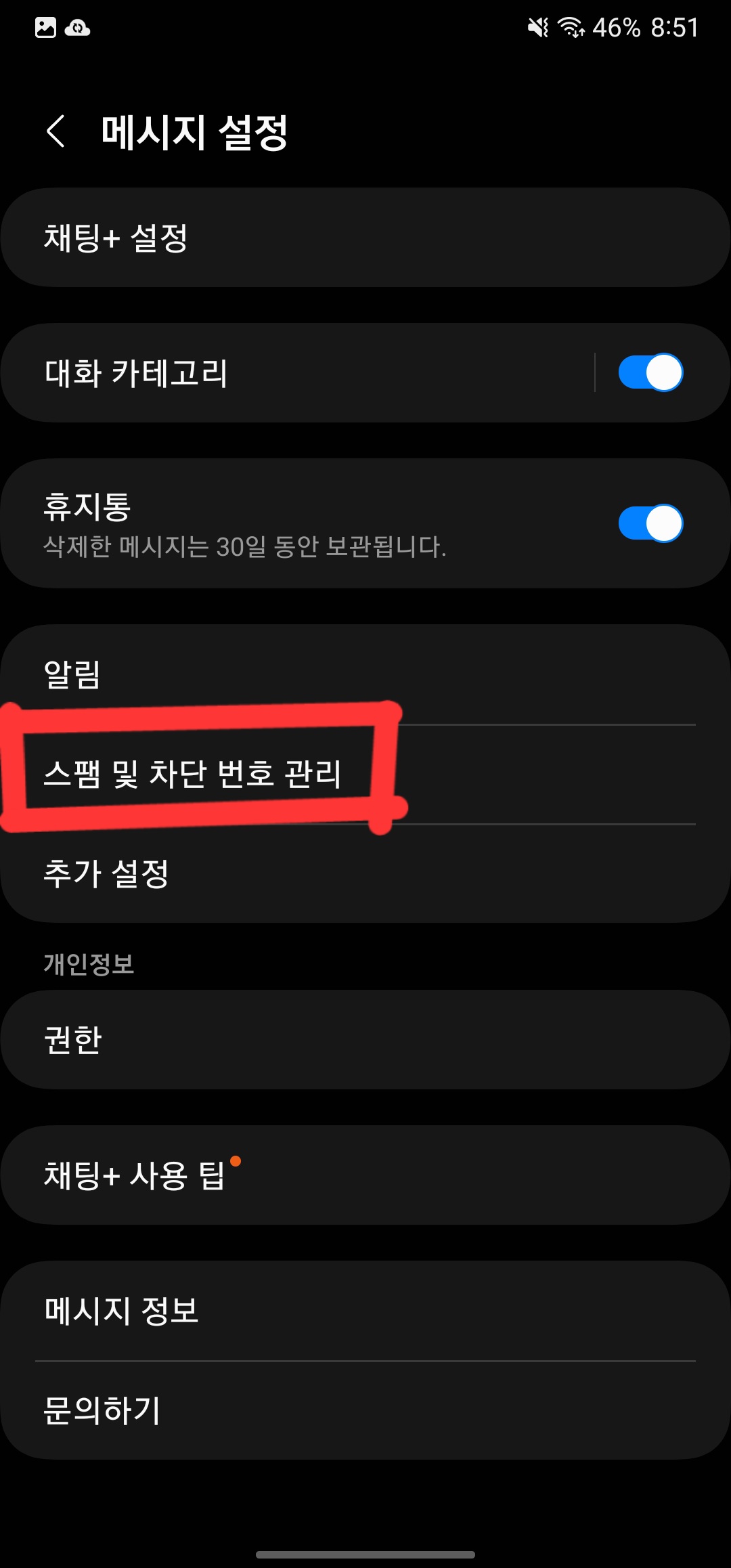 2. '스팸 및 차단 번호 관리' 선택