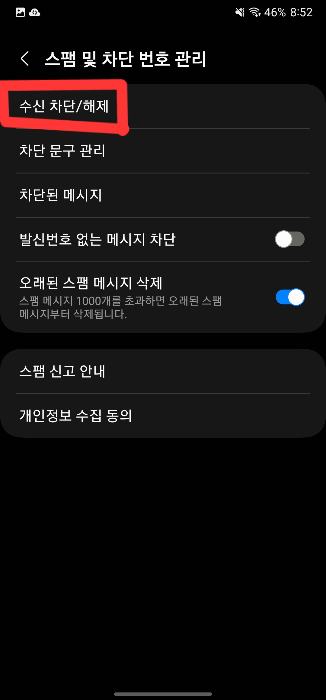 3. '수신 차단/해제' 메뉴 진입