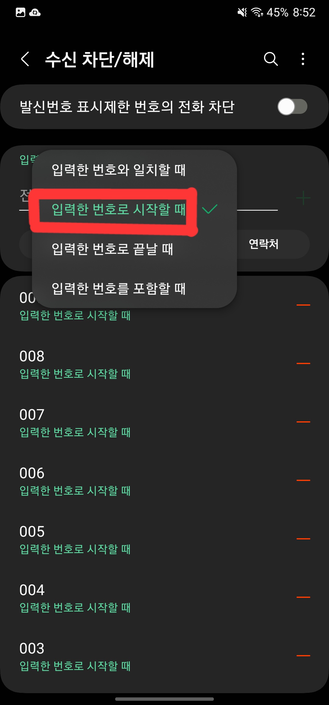 이렇게 하면 모든 국제전화 번호(001~009로 시작)를 차단할 수 있습니다.