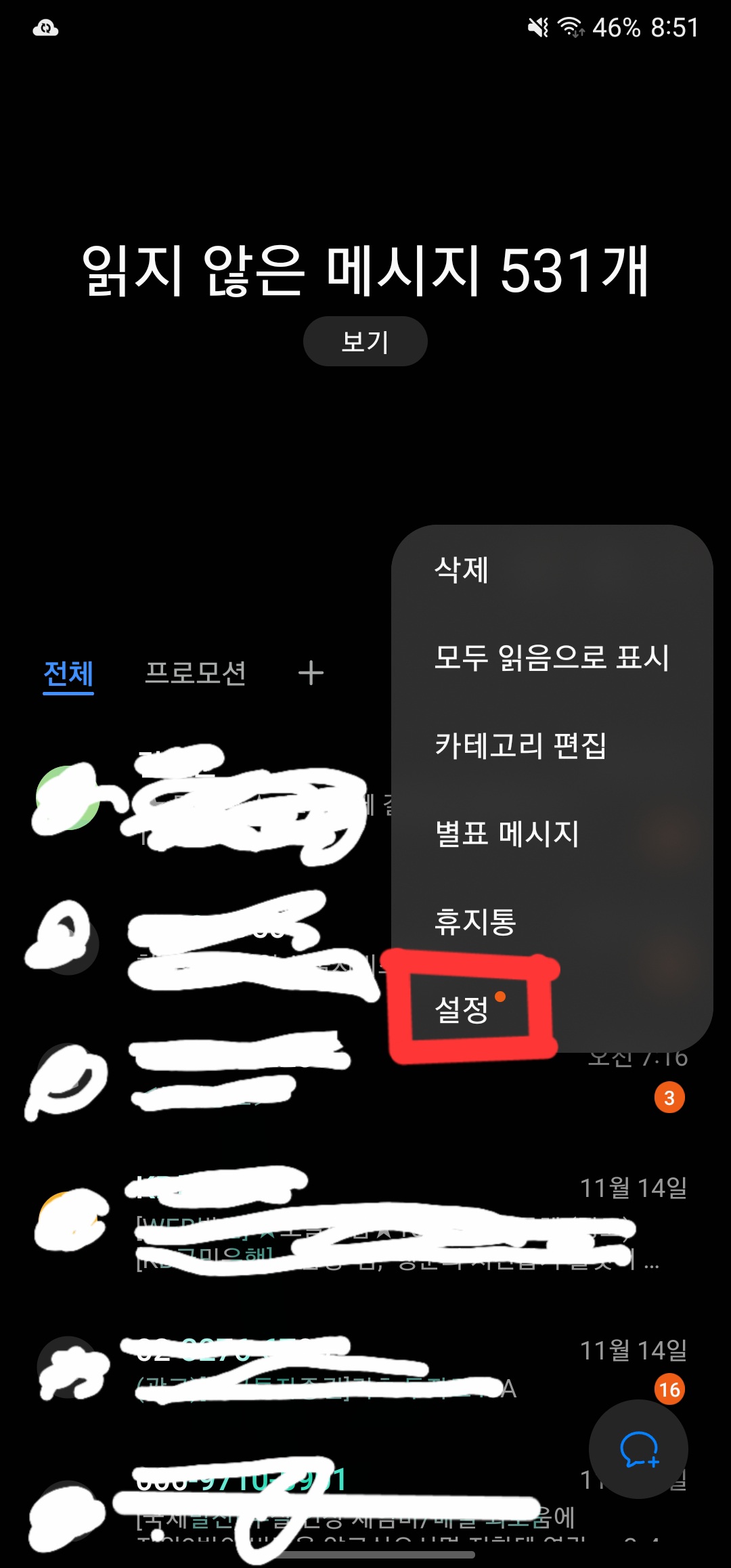 1. 메시지 앱 실행 → 문자메시지의 점 세 개(⋮) 클릭 → 설정 들어가기